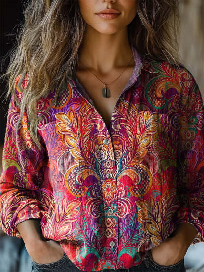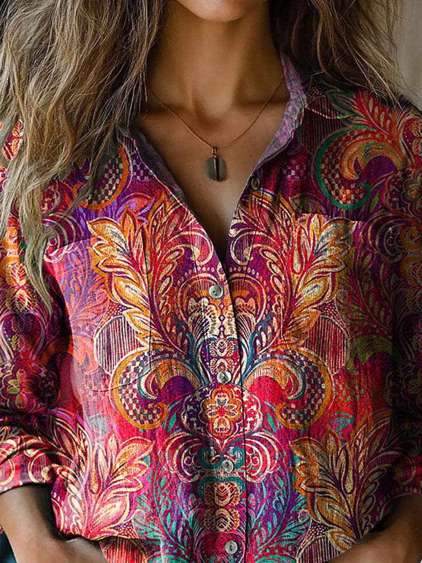 Colorful Ethnic Pattern Printed Women's Casual Long Sleeve Comfortable Cotton Shirt