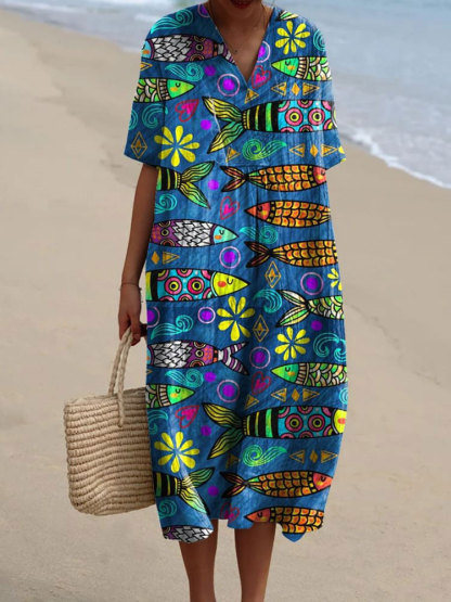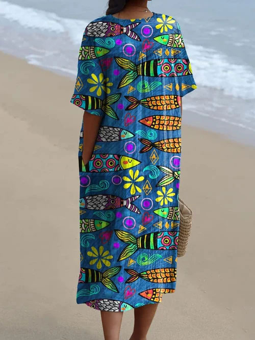 Colorful Sardine Fish Pattern Printed Women's Flowy Dress