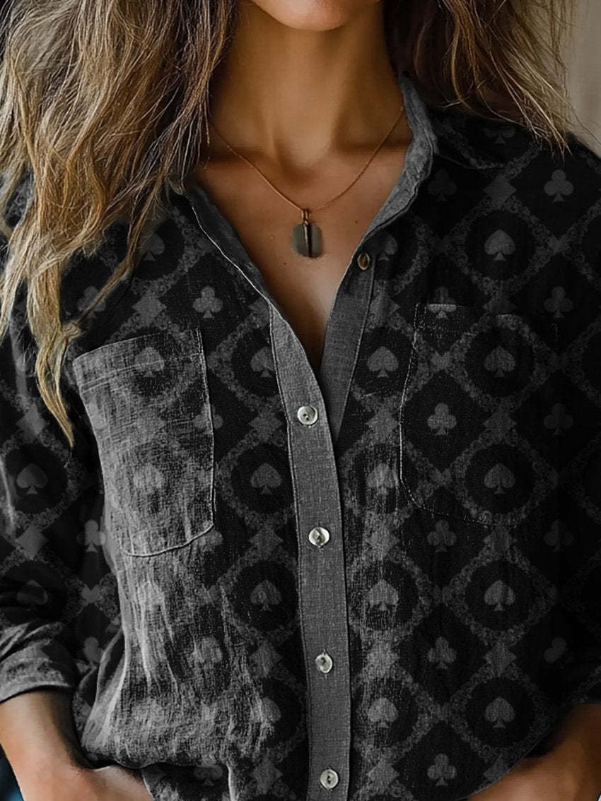 Dark Color Poker Card Pattern Printed Women's Casual Long Sleeve Comfortable Cotton Shirt