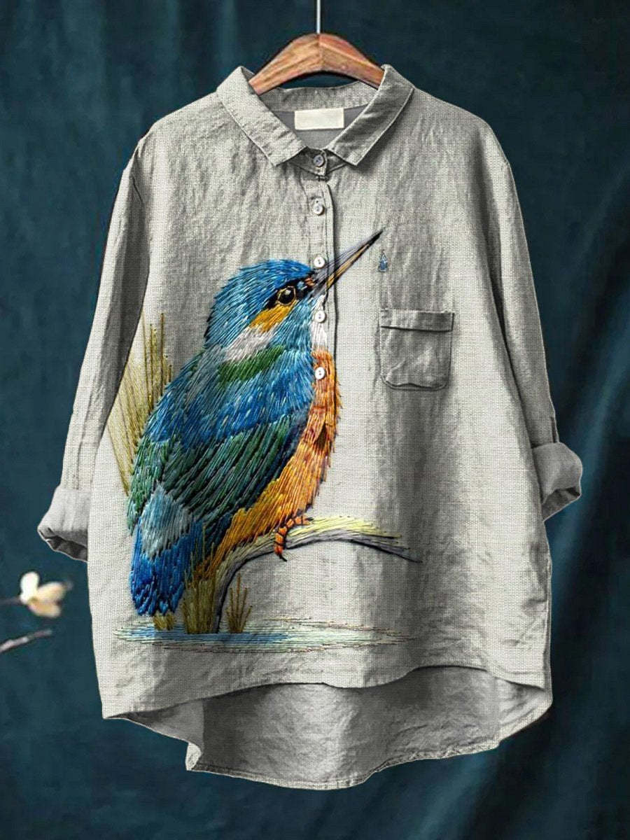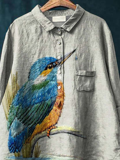 Embroidery Style Kingfisher Graphic Printed Women's Casual Cotton And Linen Shirt