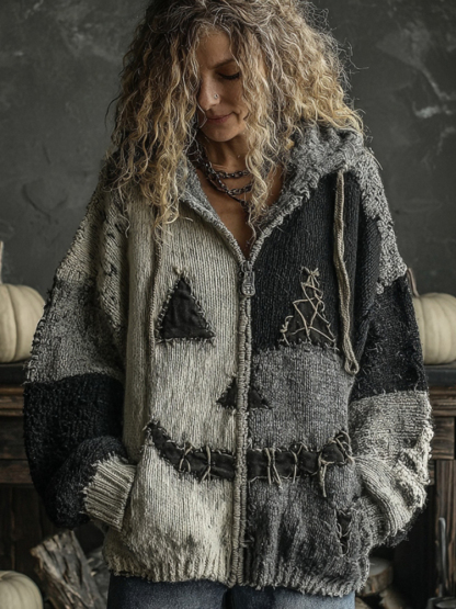Halloween Pumpkin Face Patchwork Art Cozy Knit Hooded Cardigan