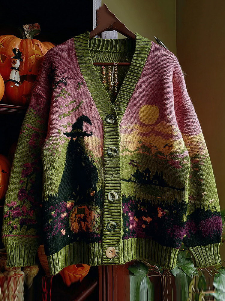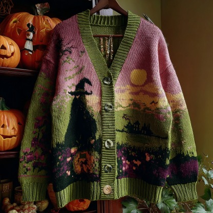 Halloween Witch Pattern Knitted Warm Sweater Cardigan
