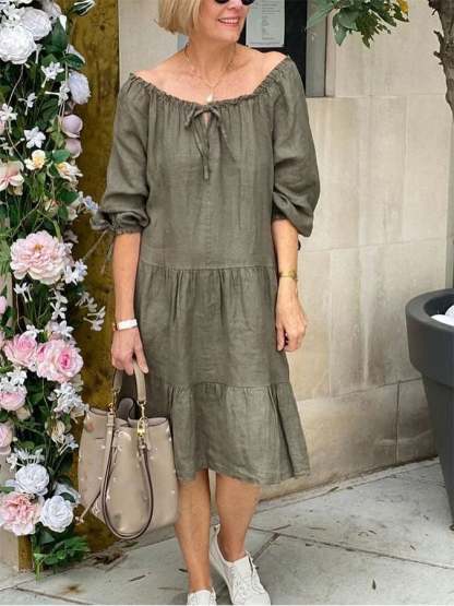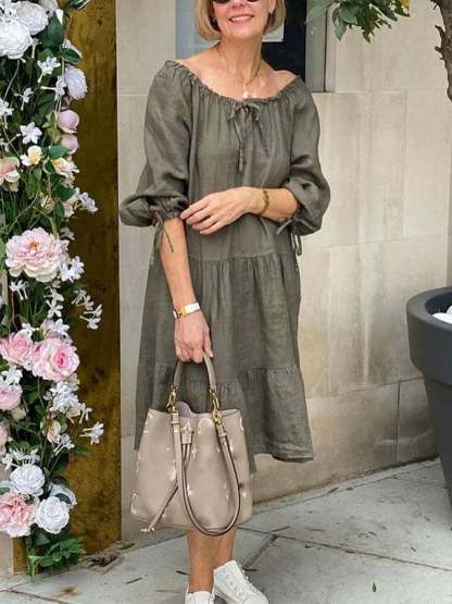 Ladies Solid Color Cotton Linen Long Sleeve Dress