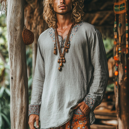 Men's Bohemian Holiday Style Vintage Linen Printed Casual Long Sleeve Top