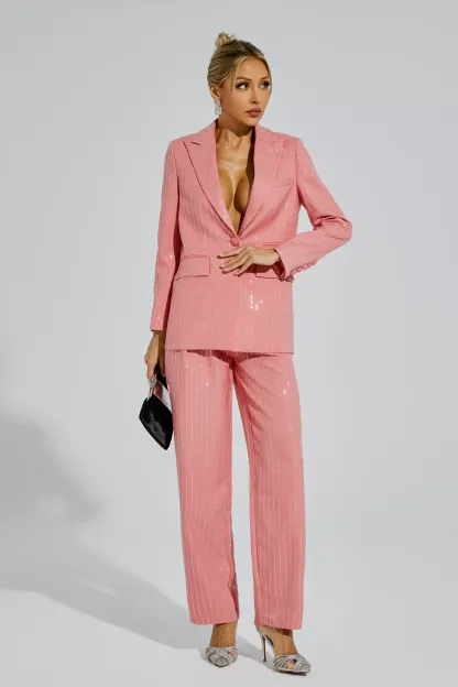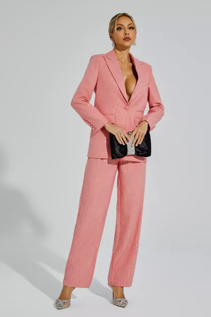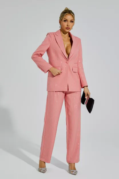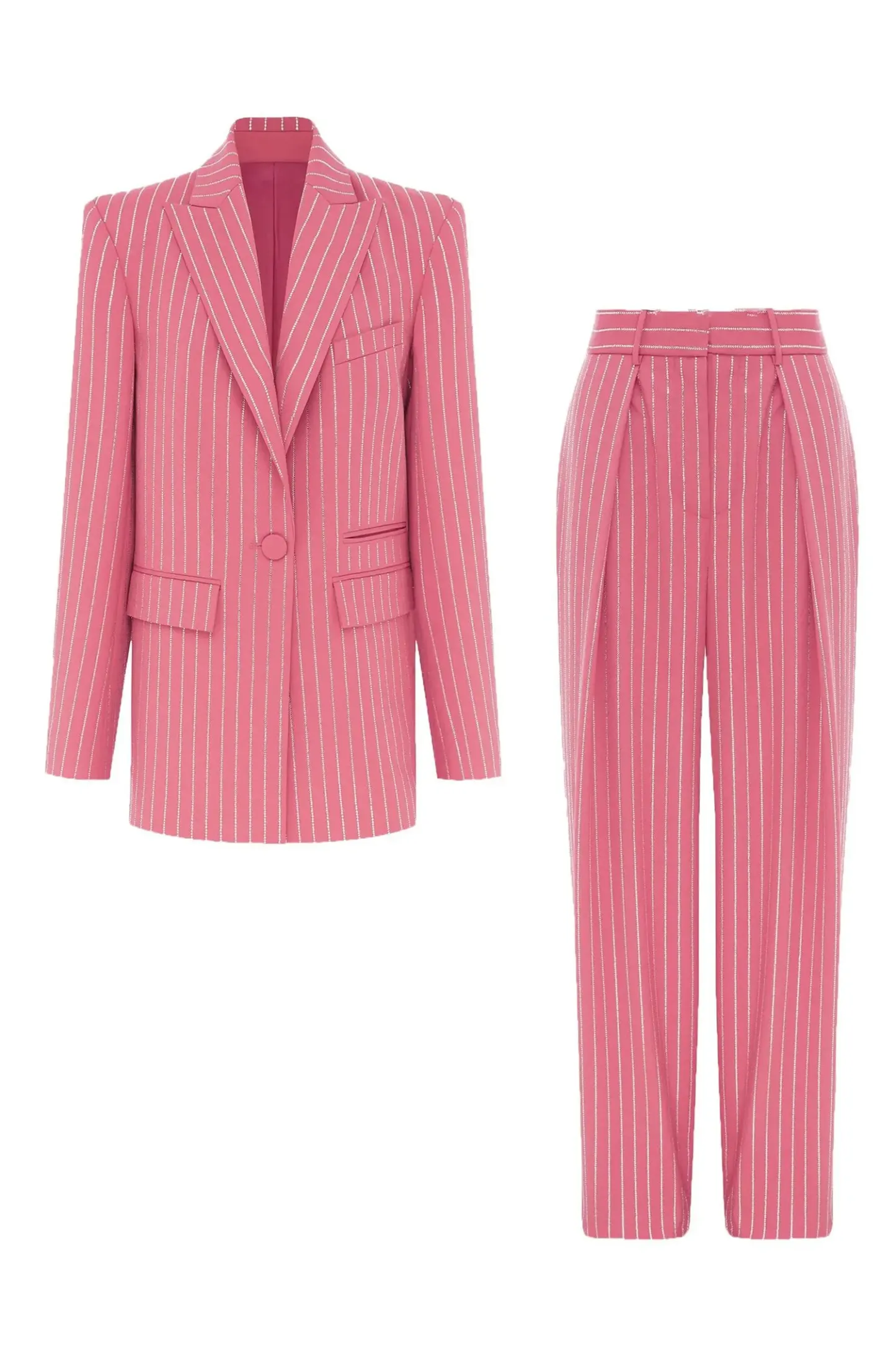 Upgrade your wardrobe with our Pink Vertical Striped Blazer Set. This two-piece set includes a loose-fit blazer and matching pants, exuding elegance and sophistication. Complete with intricate rhinestone embellishments, this ensemble is perfect for any formal or professional occasion. Dazzle the crowd with style and confidence in this stunning ensemble.