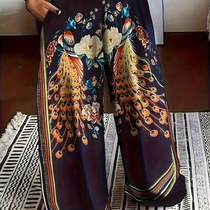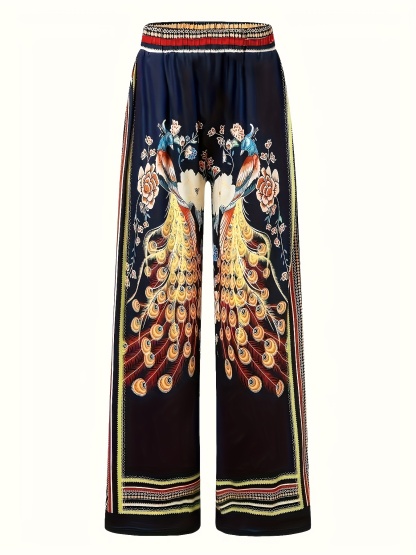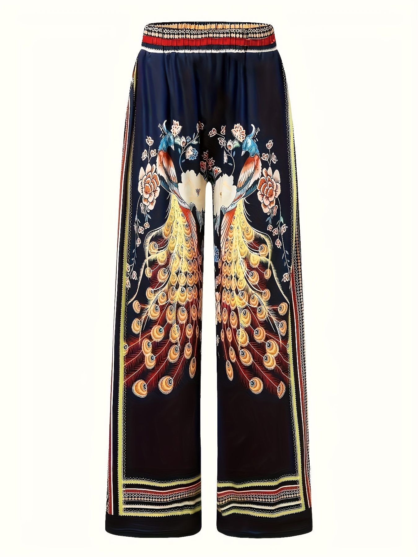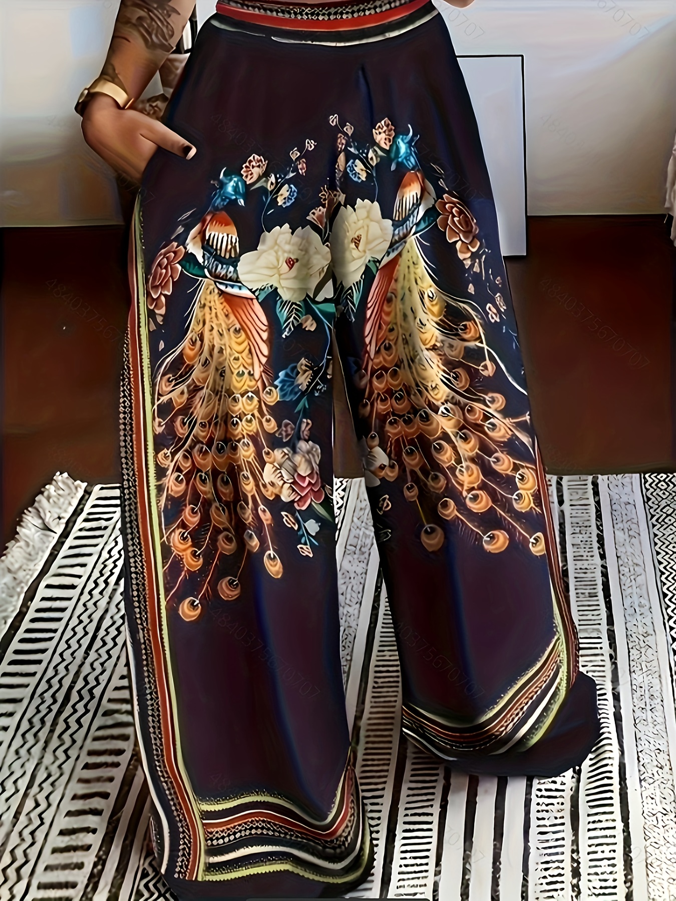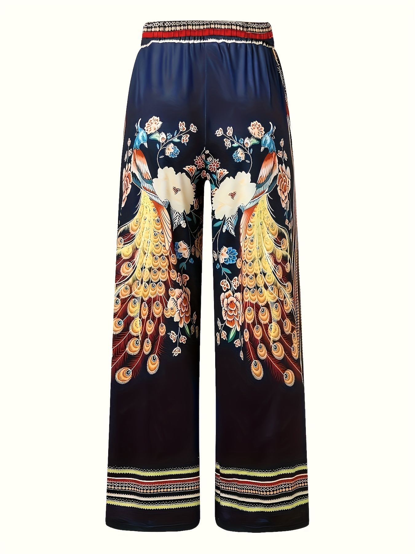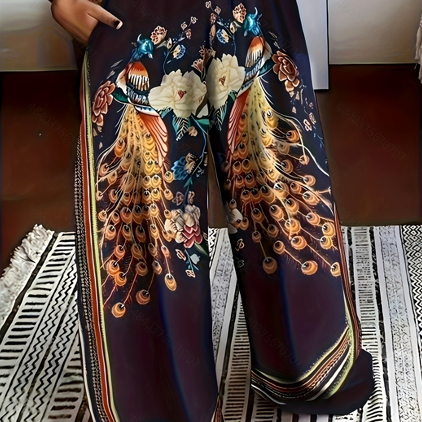 Plus Size Retro Pants, Women's Plus Floral Peacock Print Elastic High Rise Medium Stretch Wide Leg Trousers