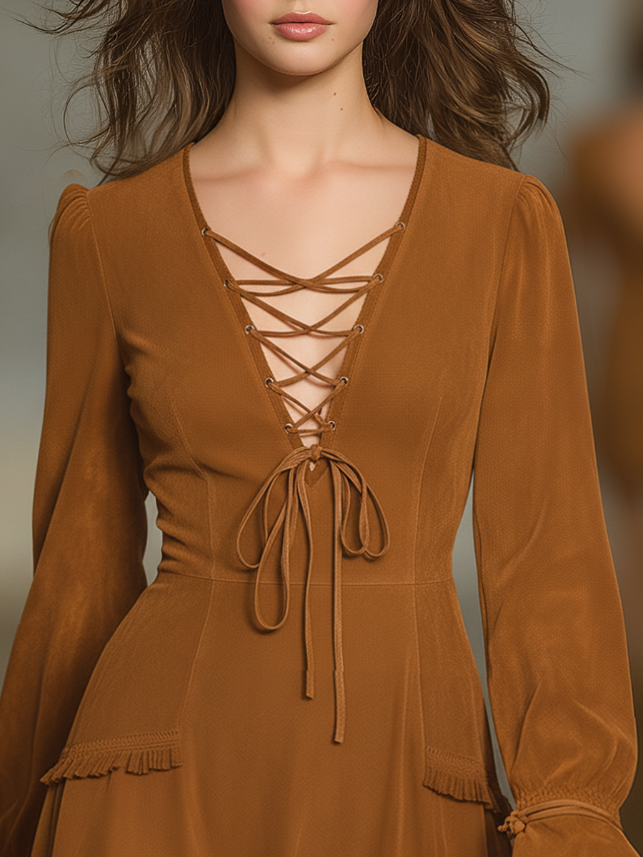 A retro Western‑style tie‑up V‑neck faux suede mini dress captures playful country charm with a modern, feminine twist. The soft faux suede fabric adds a warm, tactile richness, while the V‑neckline with tie‑up detail enhances its relaxed yet alluring character. Subtle Western elements—such as decorative stitching, panel construction, or tassel accents—bring rustic authenticity to the streamlined mini silhouette, creating a piece that feels both vintage‑inspired and effortlessly stylish.