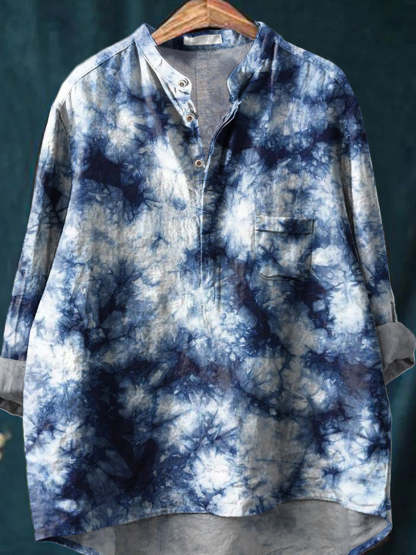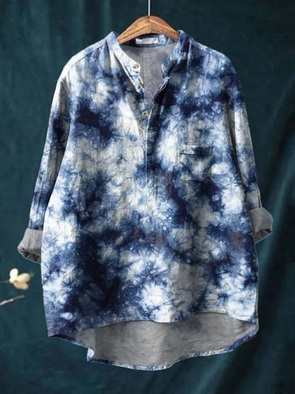 Shibori Indigo Tie Dye Pattern Printed Women's Casual Long Sleeve Comfortable Cotton Shirt