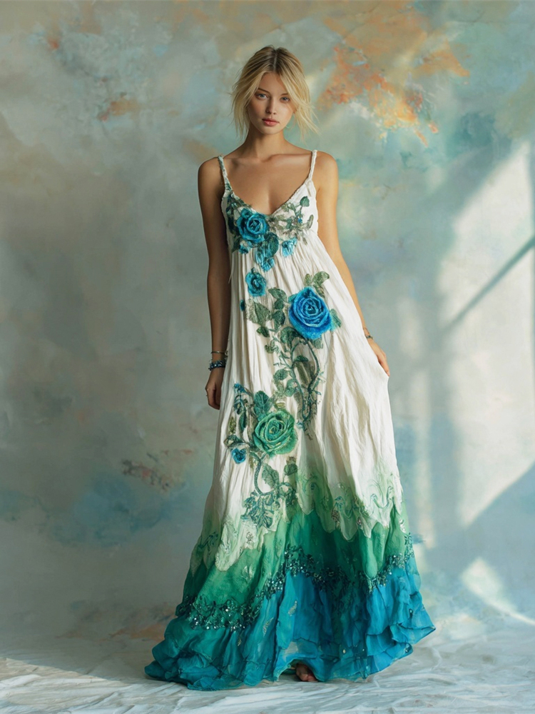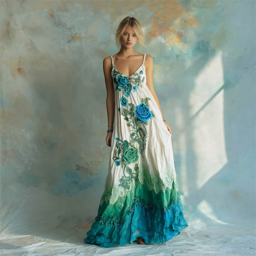 Vintage Boho Floral Gradient Embroidery Women's Spaghetti Strap Maxi Dress