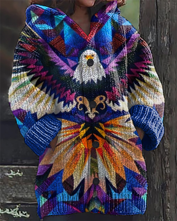 Vintage Eagle Native American Print Hooded Cardigan