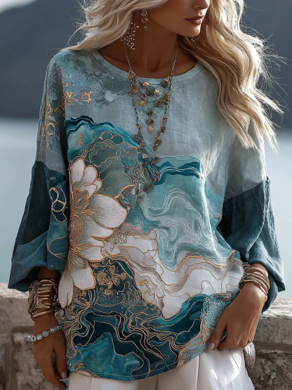 Vintage Gradient Marble Texture Floral Pattern Art Linen Three-quarter Sleeves Shirts