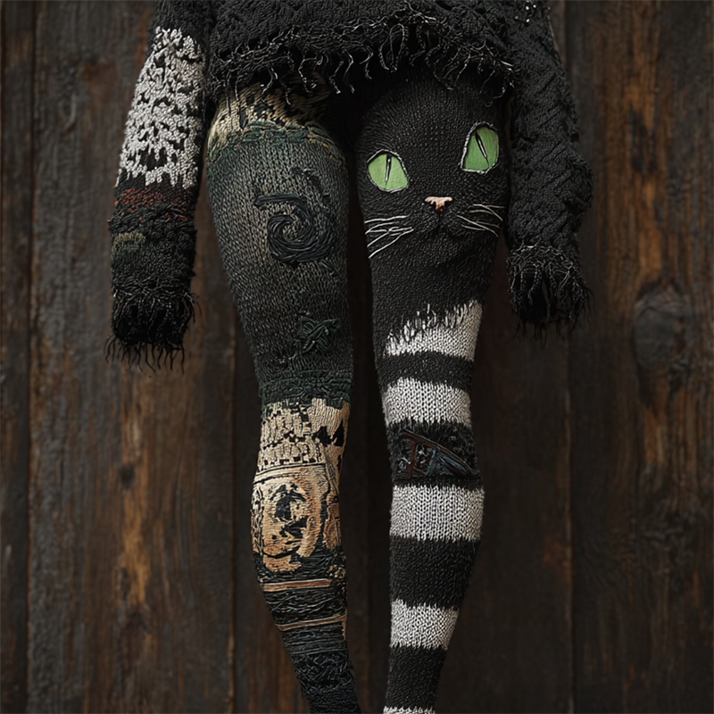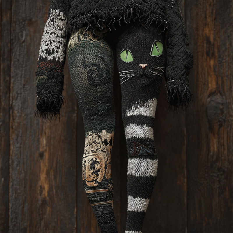 Vintage Halloween Black Cat Striped Cozy Knit Leggings