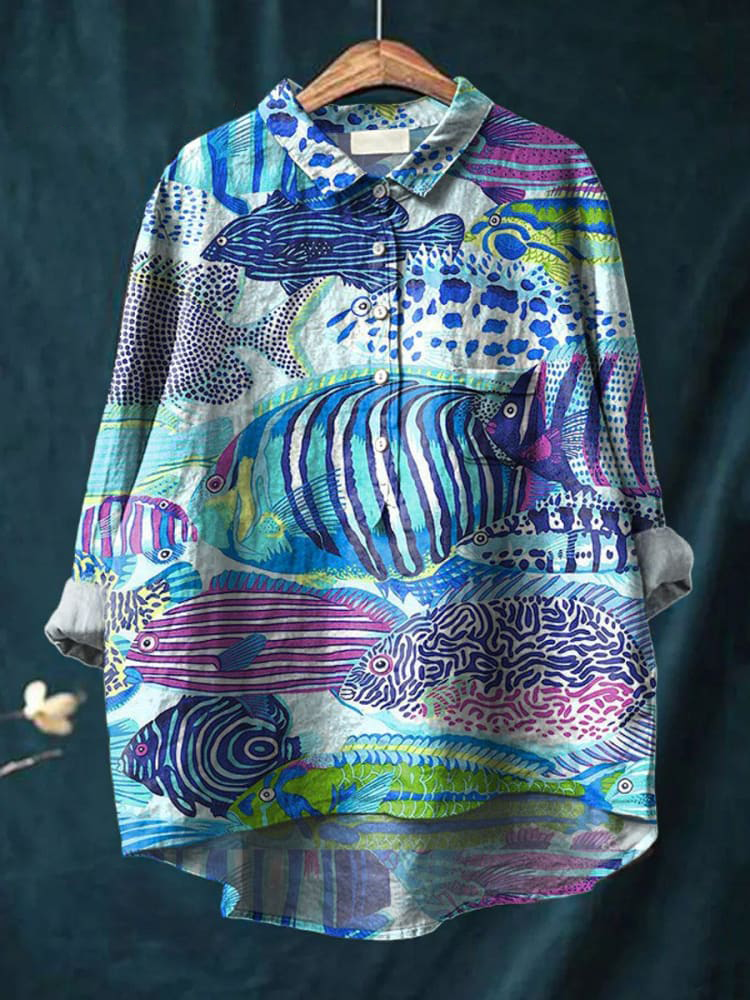 Vintage Lovely Fish Art Print Casual Cotton And Linen Shirt