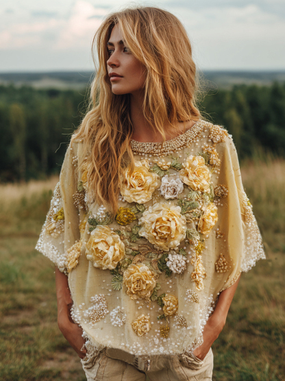 Women's Bohemian Yellow Floral Embroidery Art Linen Blend T-shirt