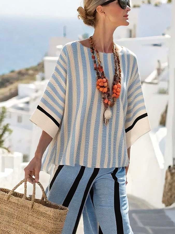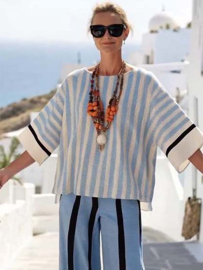 Women'S Casual Loose Round Neck Striped Print Top