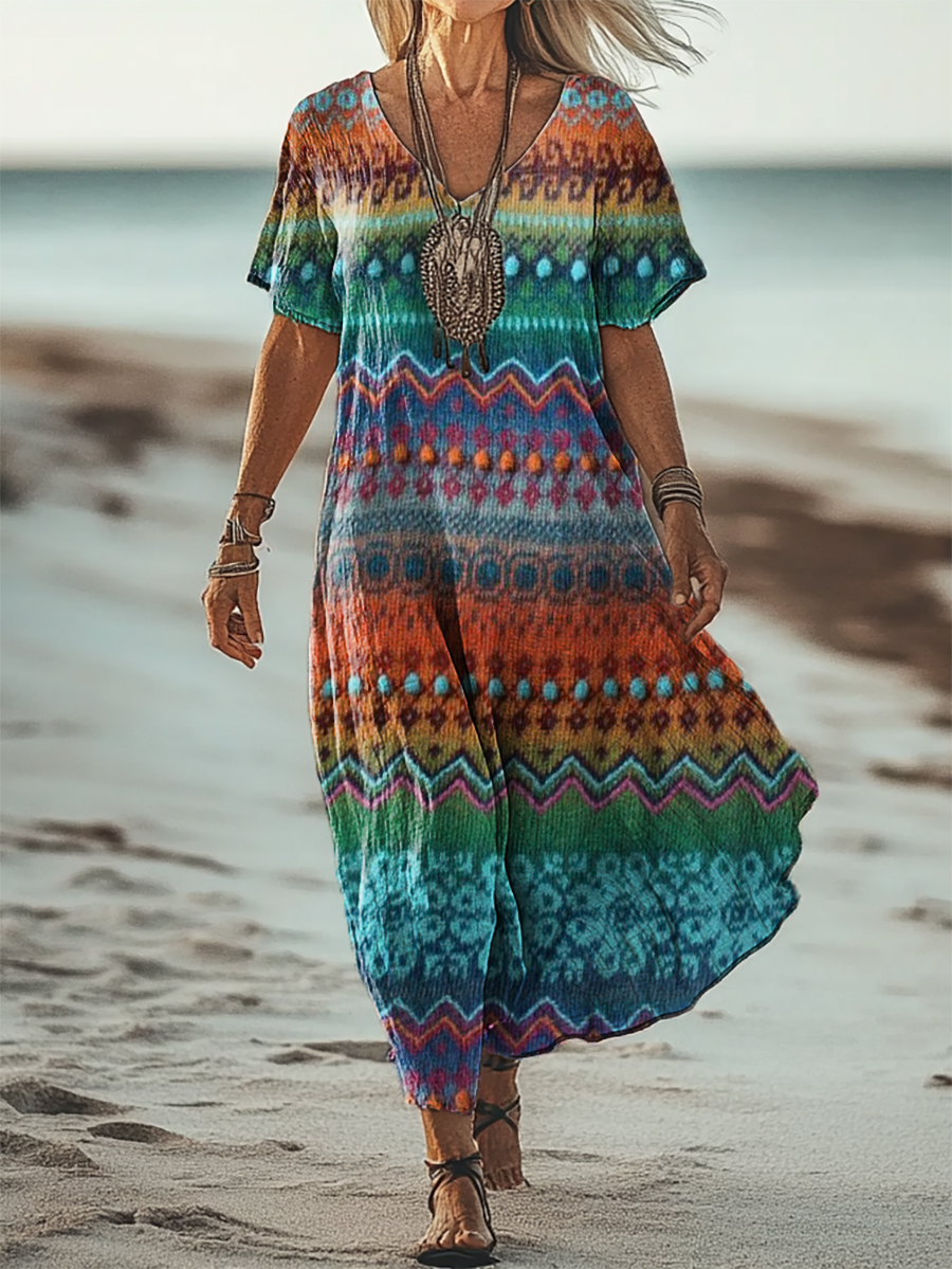 Women's Colorful Stripe Art Pattern Print Short Sleeve Pocket Cotton Linen Dress