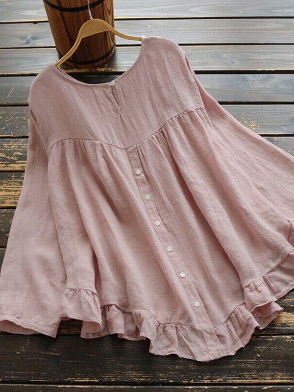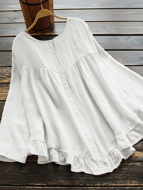 Women's Cotton Linen Solid Color Round Neck Long Sleeve Irregular Hem Shirt