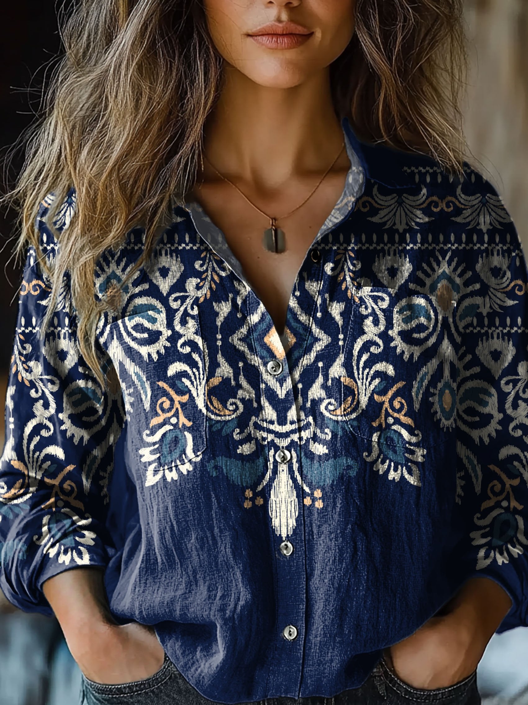 Women's Dark Blue Retro Diamond Pattern Art Print Casual Long Sleeve Comfortable Cotton Shirt