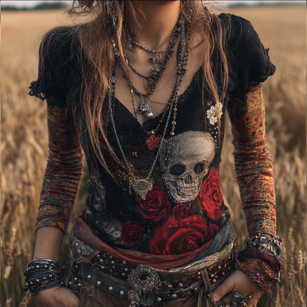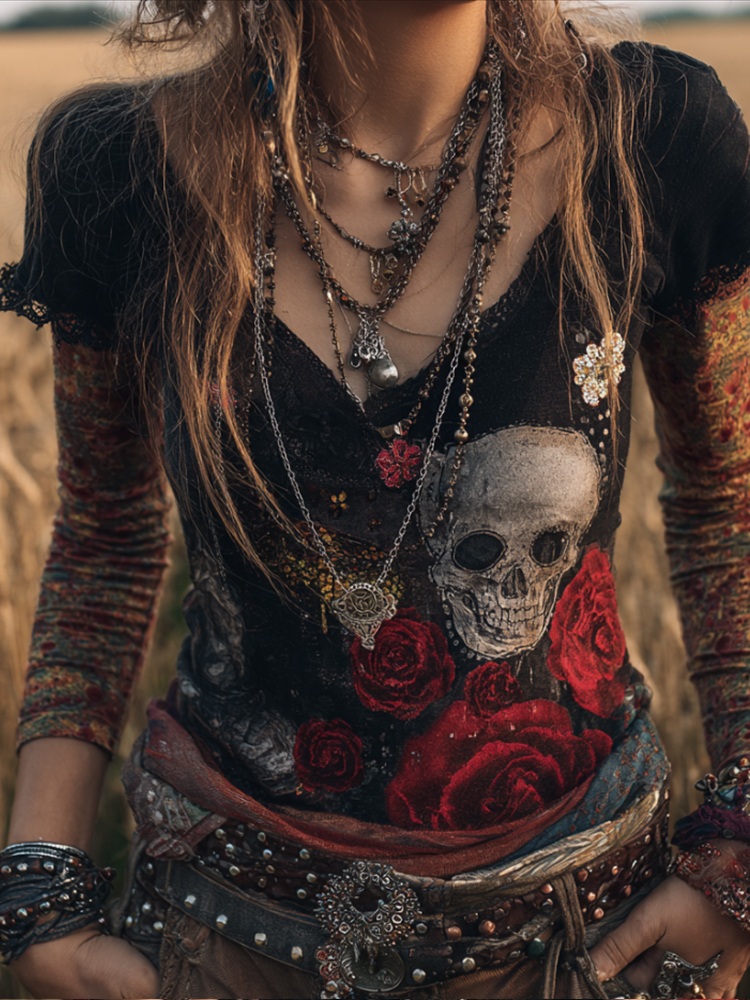 Women's Flower-skull Black Vintage Short-sleeved Shirt