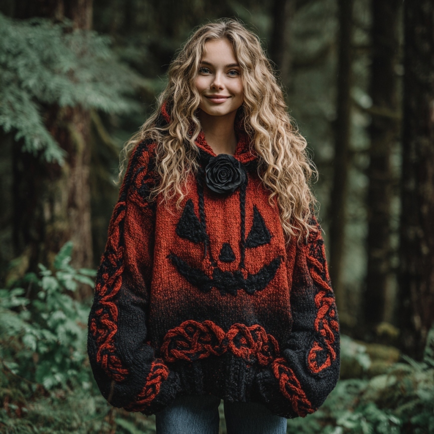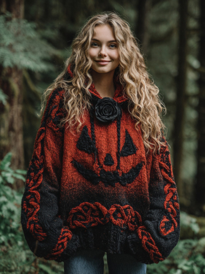 Women's Halloween Spooky Face Celtic Gradient Art Cozy Knitted Hooded Sweater