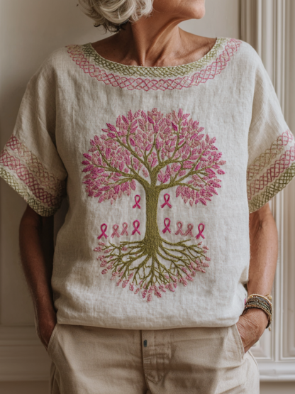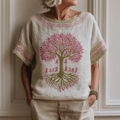 Women's Health Tree Of Life Pink Ribbon Round Neck T-shirt