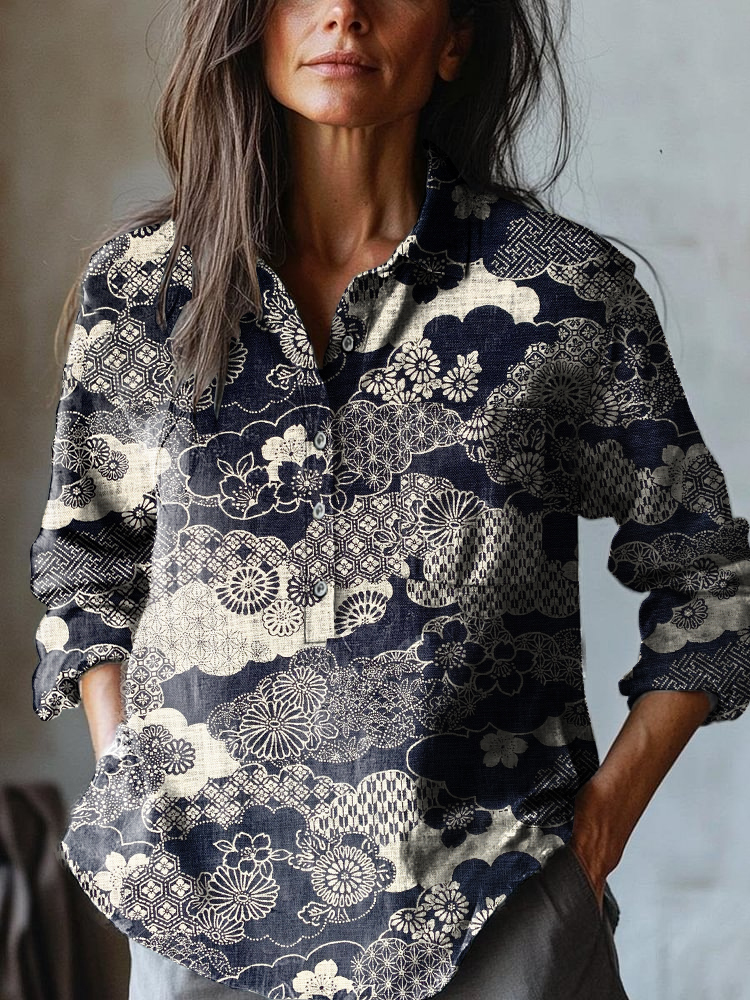 Women's Japanese Classic Flying Cranes Art Print Casual Cotton And Linen Shirt