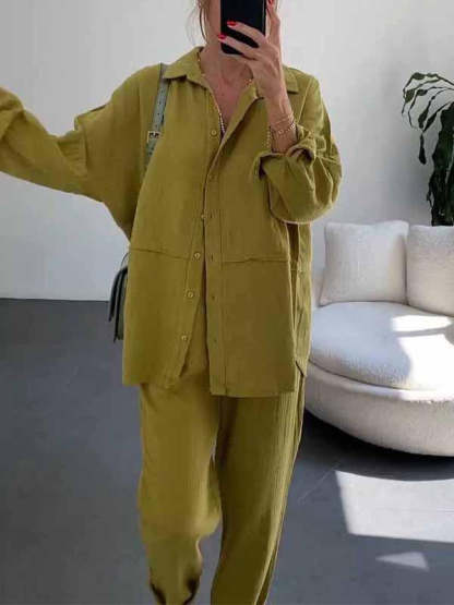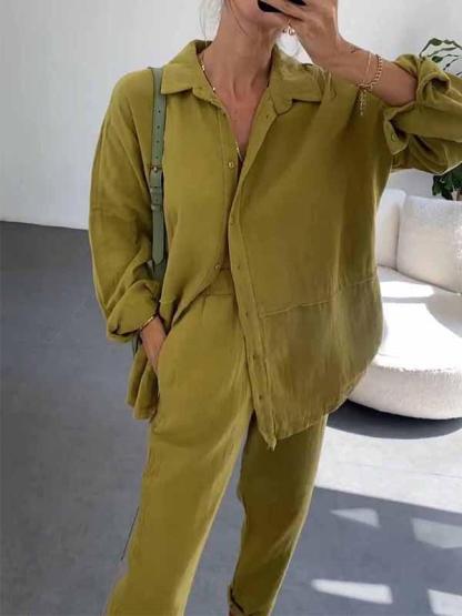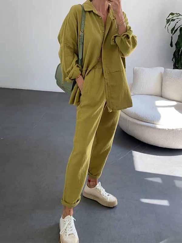Women's Lapel Solid Color Cotton and Linen Two-piece Suit