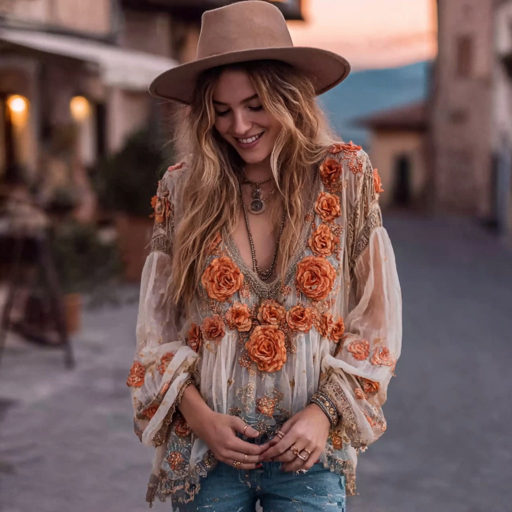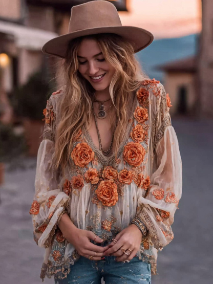 Women's Orange Rose Embroidery Casual V-neck Shirt