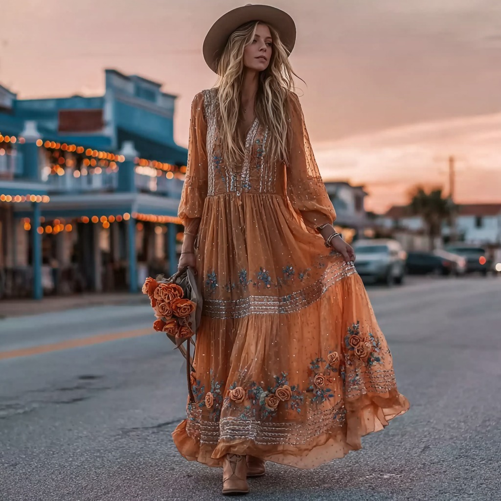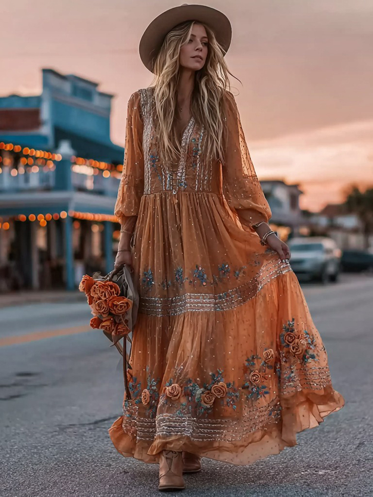 Women's Orange Rose Gilded Pattern Elegant Long Sleeve V-neck Dress