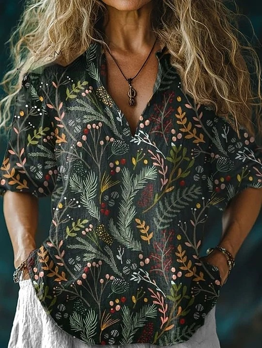Women's Retro Art Print Casual Linen V-neck Shirt