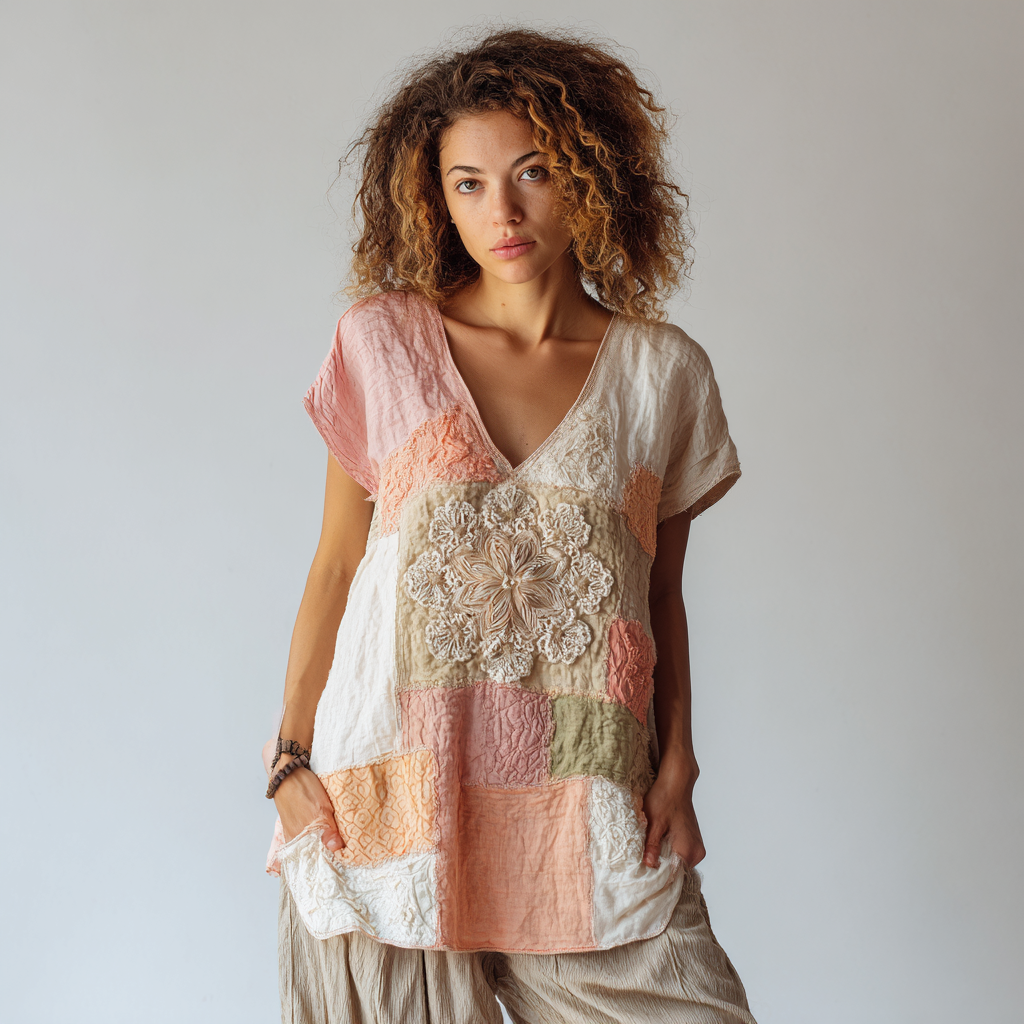 Women's Retro Floral Art Stitching Short Sleeve T-shirt