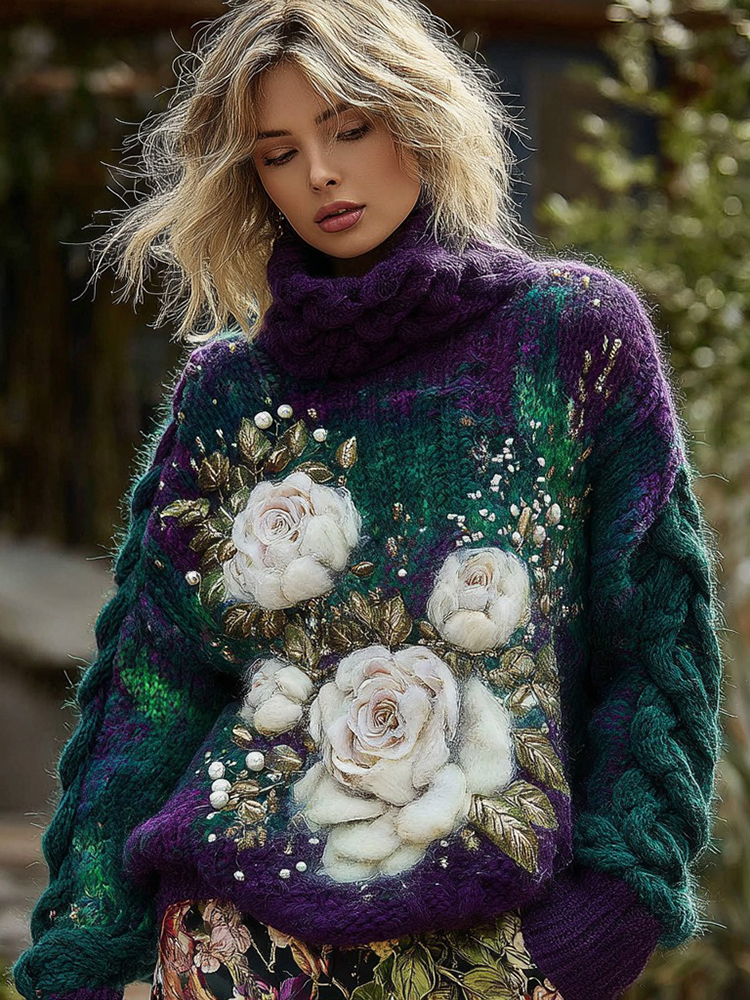 Women's Retro Rose Gradient Knitted Warm Turtleneck Sweater