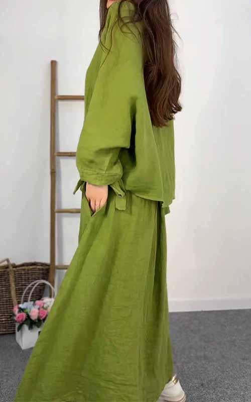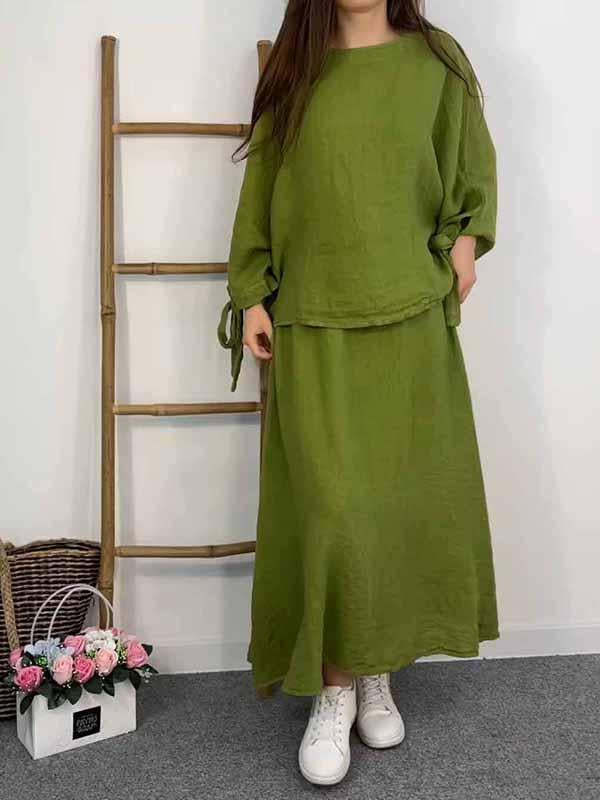 Women's Round-neck Solid Color Cotton and Linen Two-piece Suit
