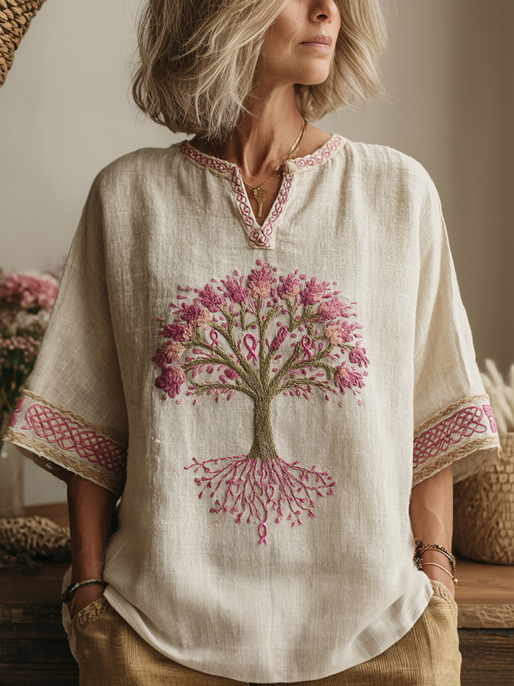 Women's Tree Of Life Pink Ribbon Small V Neck T-shirt