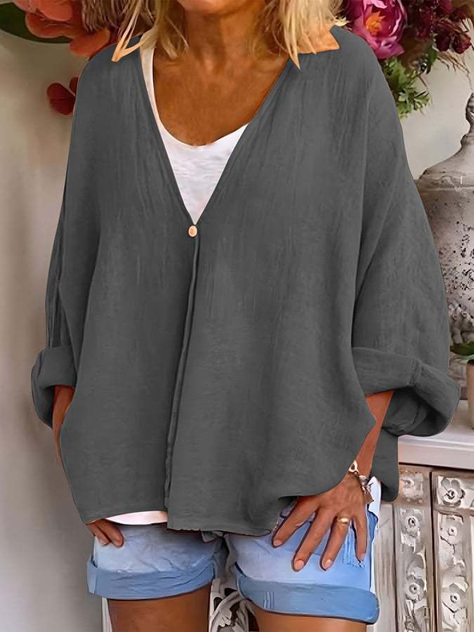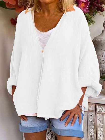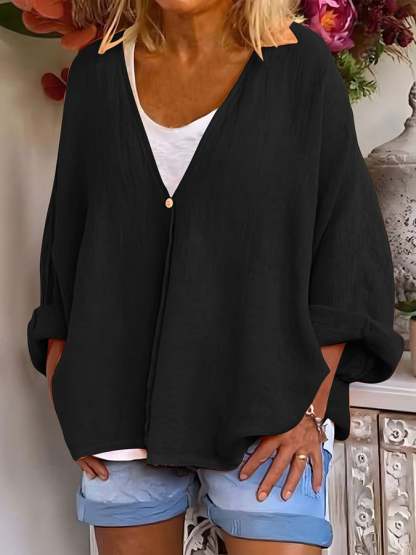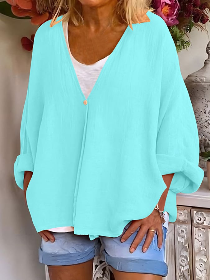 Women's V-Neck Long Sleeve Loose Button Design Casual Shirt