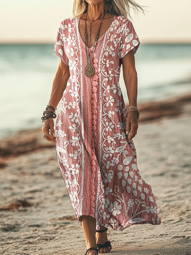 Women's Vintage Ethnic Floral Art Print Pocket Cotton Dress