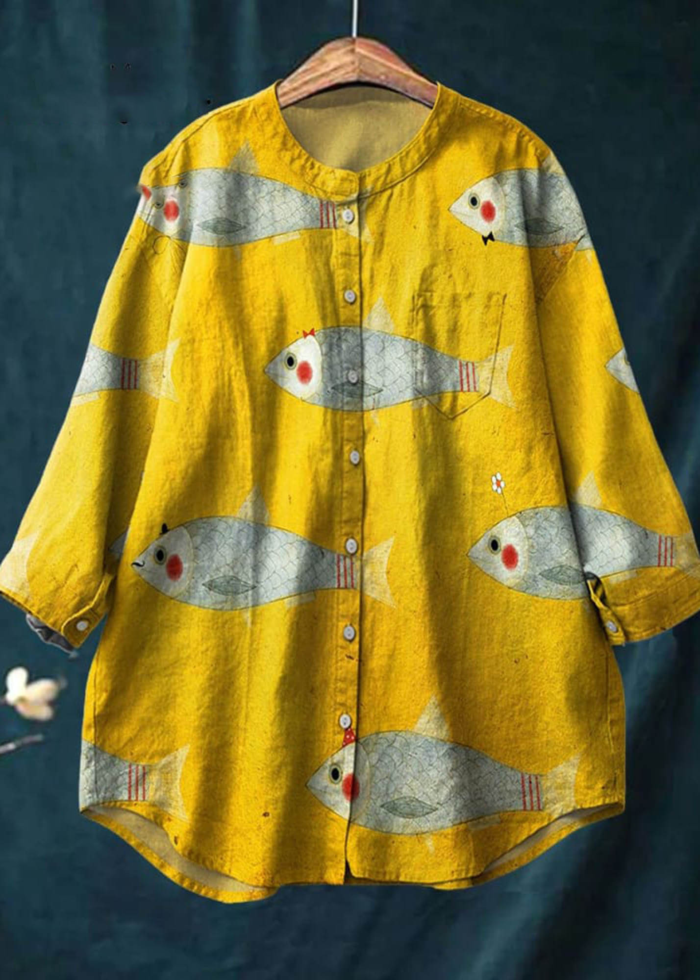 Women's Vintage Fish Art Print Casual Cotton And Linen Shirt