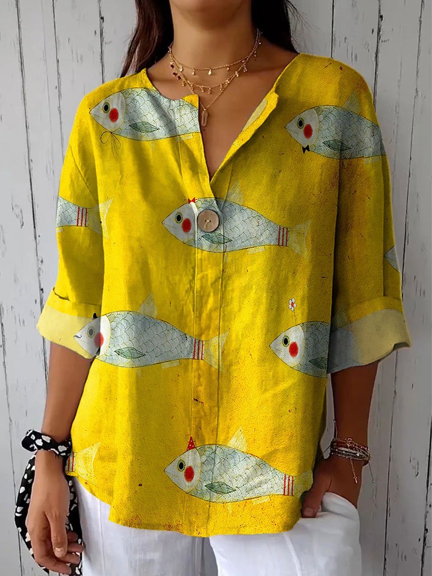 Women's Vintage Fish Art Print Casual Cotton Linen Shirt