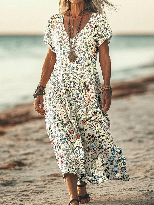 Women's Vintage Floral Art Print Pocket Cotton Dress
