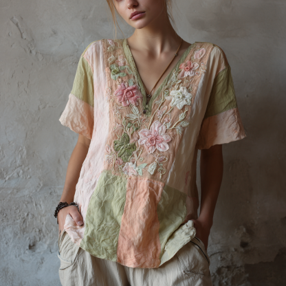 Women's Vintage Floral Art Stitching V-neck T-shirt