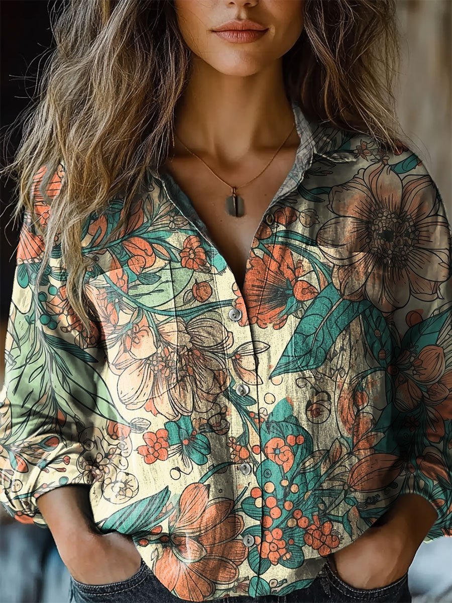 Women's Vintage Flower Art Print Casual Long Sleeve Comfortable Cotton Shirt
