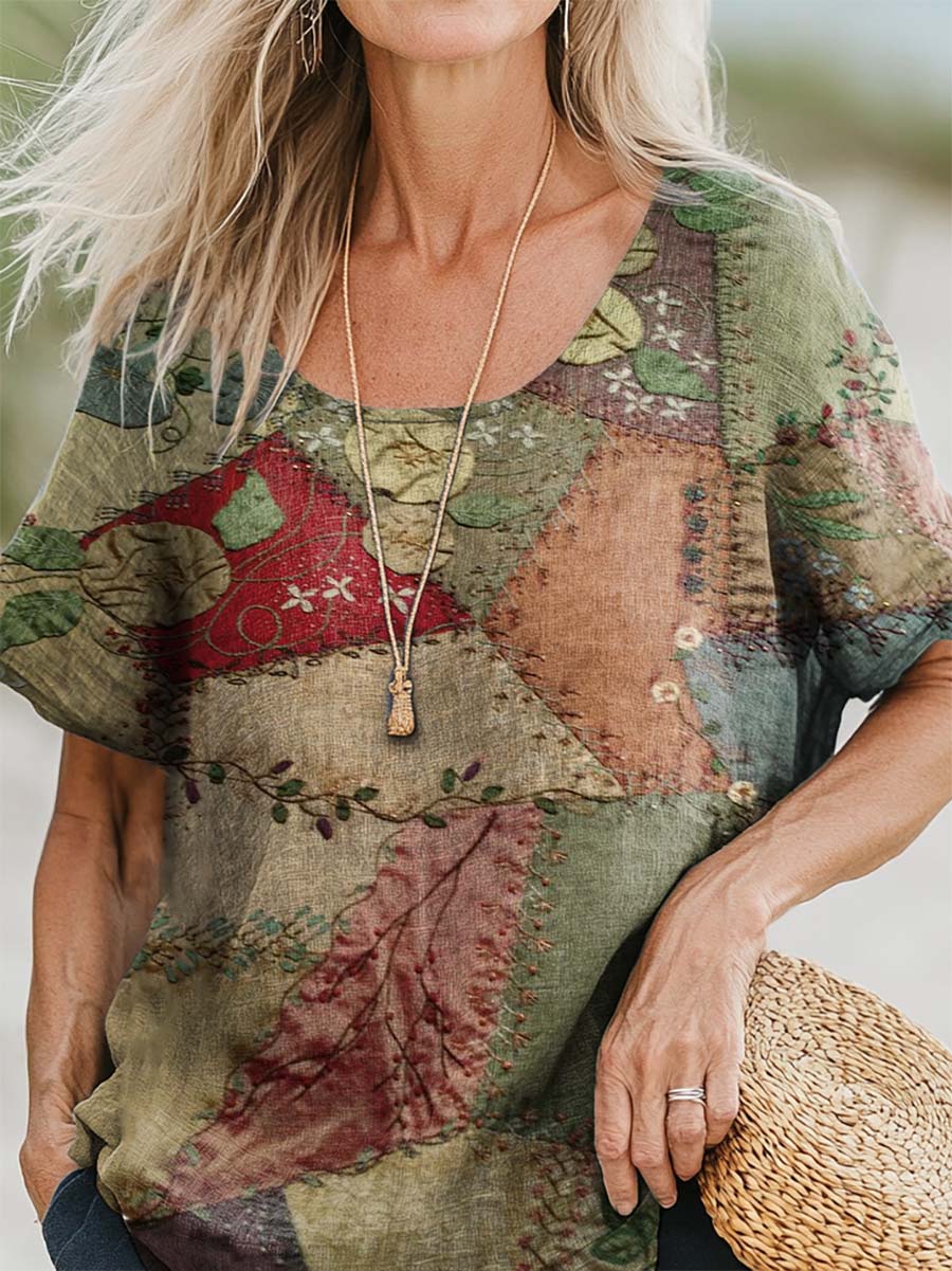 Women's Vintage Patchwork Print Casual Cotton And Linen 3/4 Sleeve Shirt