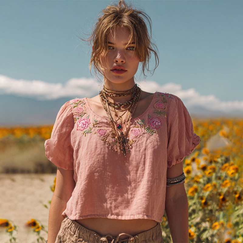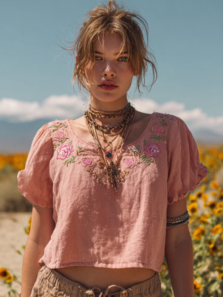 Women's Vintage Pink Floral Art Embroidery Linen T-shirt