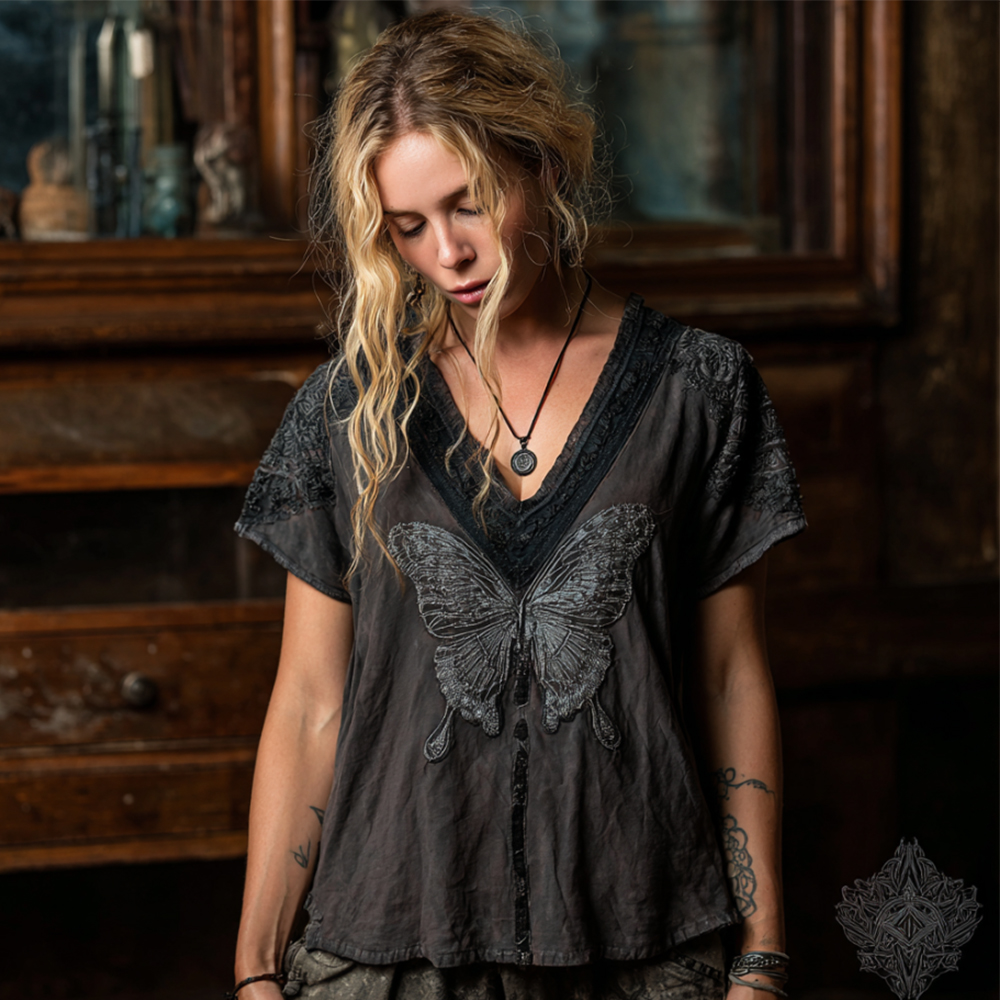 Viking Dark Style Thorn Butterfly Embroidery Vintage V-neck Short-sleeve Top