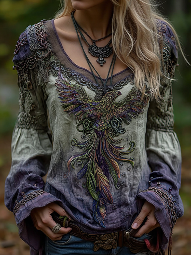 Women's Vintage Viking Celtic Knot Phoenix Embroidery Gradient V-neck T-shirt