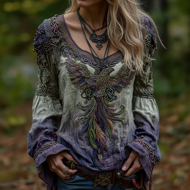 Women's Viking Celtic Phoenix Totem Gradient Linen Long Sleeve T-shirt