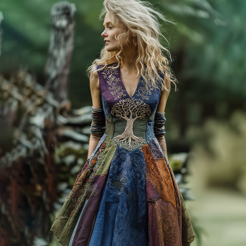Women's Celtic Tree Of Life Patchwork Linen Midi Dress