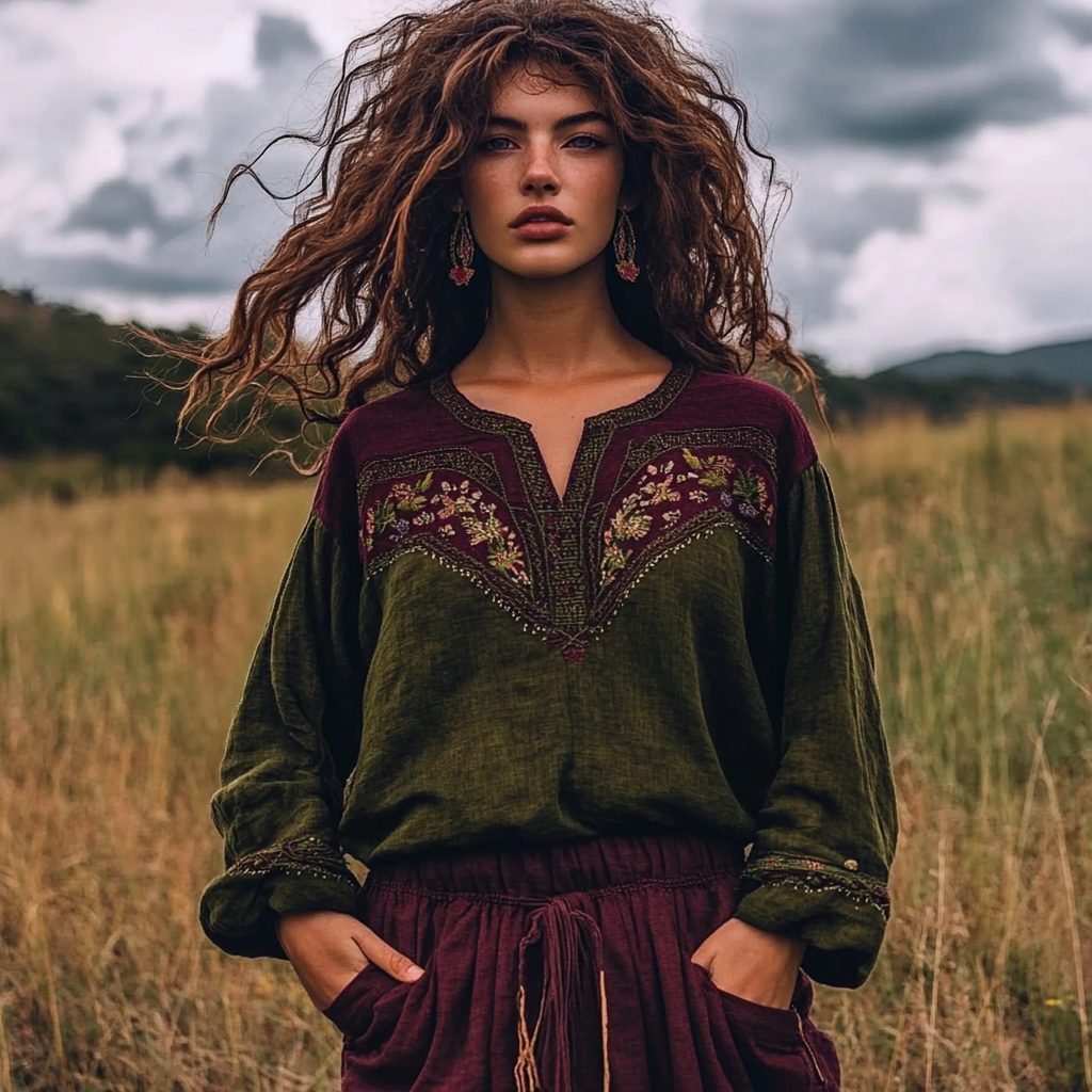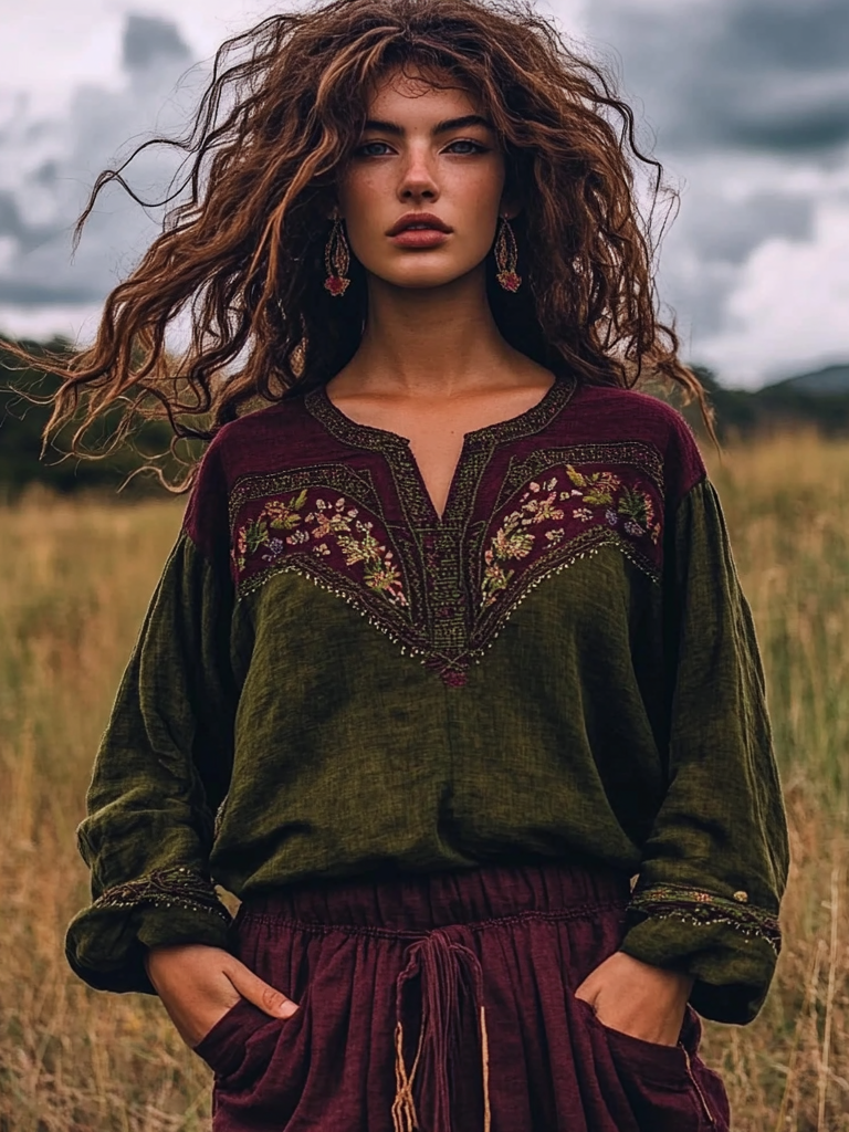 Boho Floral Tassel Art Linen Blend Loose Blouse