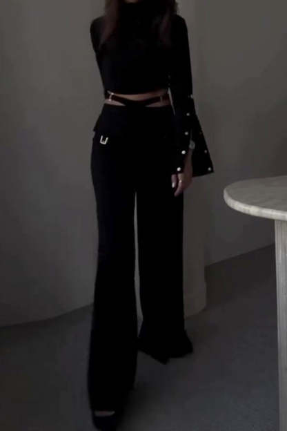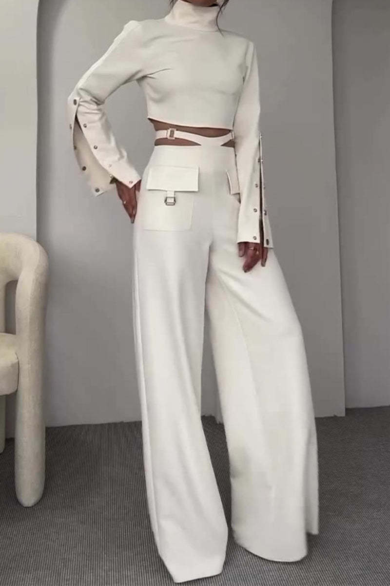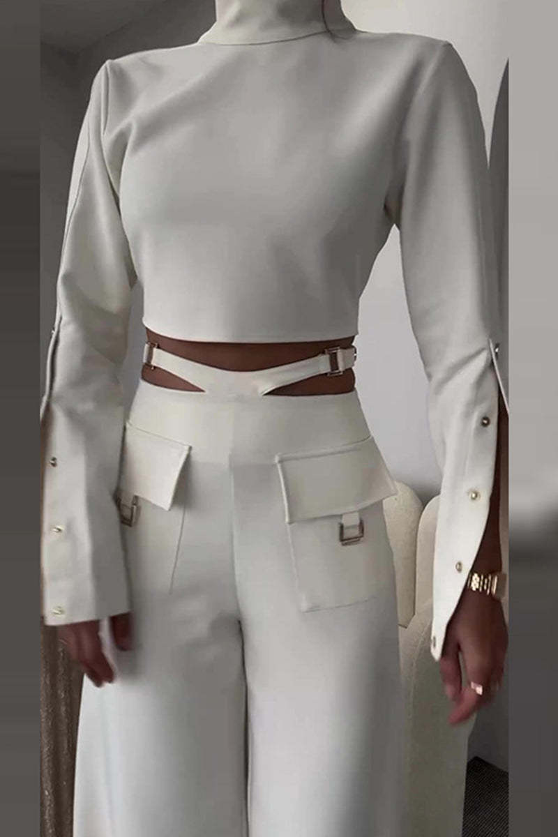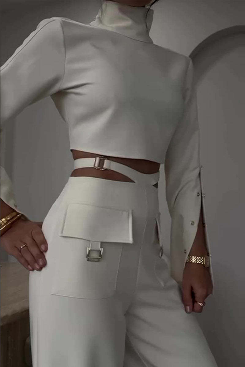 Casual Solid Hollowed Out Metal Accessories Decoration Turtleneck Long Sleeve Two Pieces