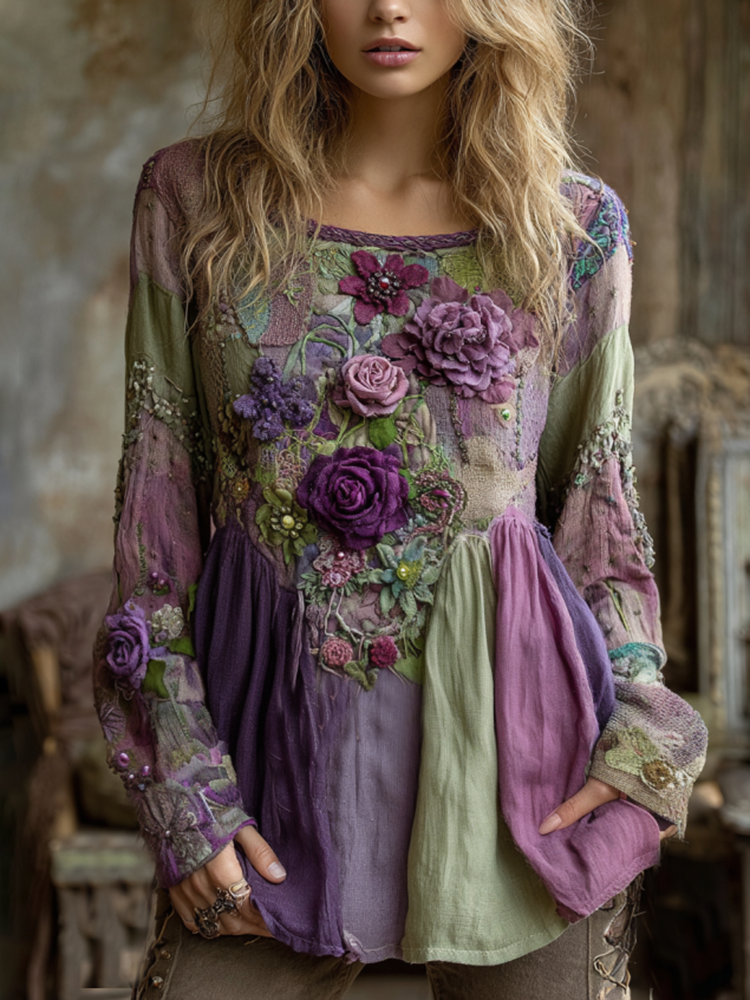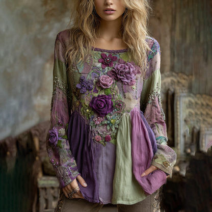 Classy Vintage Floral Splicing Cotton And Linen Long Sleeve Shirt